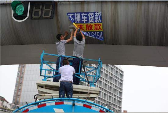 目測人行道過街天橋橋身垂直距離地面8米,100cm*80cm見方的藍(lán)色 “牛皮鮮”上印著車貸廣告。關(guān)注到這些廣告的市民都在猜:“這么高的天橋,牛皮蘚是么樣貼上去的?”據(jù)青山城管“三亂”整治專班負(fù)責(zé)人介紹,友誼大道兩座天橋東南西北四個(gè)方向的紅綠燈旁均被貼上了同一內(nèi)容的“牛皮癬”,應(yīng)該是前天晚上(11日)干的,估計(jì)有兩種方式張貼:一是借助比較高的車身站立進(jìn)行,這需要大型車輛配合;二是腰系安全帶從橋面懸垂下去,這很簡單,但是很危險(xiǎn)。不管是怎么貼上去的,只要發(fā)現(xiàn)一處,就清理一處,這點(diǎn)事難不倒我們。有困難找龍豪升降機(jī),除了及時(shí)清理外,還將對當(dāng)事人展開調(diào)查,依法進(jìn)行處置。